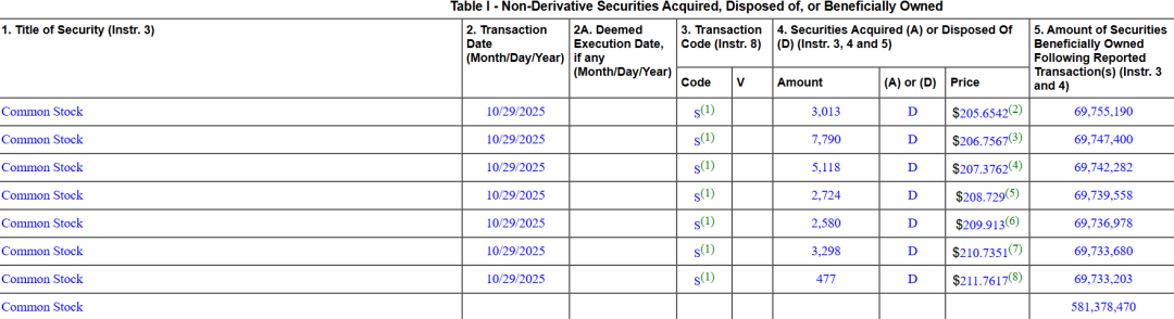 公司掌舵人减持公司股票一般会让公司股票承压。但黄仁勋持续减持并未影响英伟达股票屡创新高。 10月29日,英伟达的市值如火箭般冲破5.05万亿美元大关,仅用113天便从4万亿美元跃升至5万亿美元,其股价今年累计飙升54%,自年内低点反弹逾 135%。福布斯实时富豪榜显示,黄仁勋的个人财富突破了1800亿美元,财富排名全球第八。 股价强势的背后,是英伟达扎实的基本面支撑。财报显示,英伟达第二财季实现营收467.43亿美元,同比增长56%,略高于分析预期的462.3亿美元。其 中,第二财季数据中心收入为411亿美元,略低于分析师预期的412.9亿美元。 英伟达CEO黄仁勋完成了今年的股票出售计划,自6月下旬以来累计套现超过10亿美元。但英伟达股价今年仍然大幅上涨并突破5万亿美元市值。 单日减持2.5万股 根据英伟达向SEC提交的文件显示,黄仁勋在10月29日单日减持2.5万股,减持完成后个人仍然持有英伟达股票6973万股。 | | | | Table I - Non-Derivative Securities Acquired, Disposed of, or Beneficially Owned | | | | ...