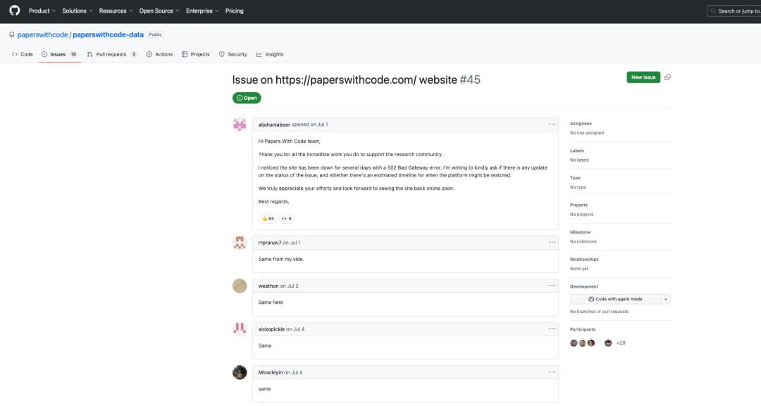 Paper With Code 已经正式停止运营,遍布全球的深度用户纷纷发声,一方面高度赞扬该网站在机器学习研究中的价值,另一方面也表达了真实需求—— 除论文与开源代码的对应外,SOTA、leaderboards 等功能同样重要。 随着 Hugging Face 联合创始人兼 CTO Julien Chaumond 在其 X 账号上官宣推出「Trending Papers」,Paper With Code 关闭的消息一锤定音,「震」得不 少开发者、科研人员心痛不已。 一个时代的结束 从数据集标题、描述等内容乱码,到网站显示「Bad Gateway 502」,Paper With Code 自 7 月初便出现了宕机、访问异常的情况,但官方迟迟没有出面回 应,有用户通过 GitHub Issue 的形式向其运营团队询问进展,同样未有回复。 作为科研人员的「快乐老家」,这个聚集了论文、代码、benchmarks、leaderboards 等多类资源的平台,在全球范围内拥有大量拥趸,随着越来越多的 开发者、科研人员察觉无法访问网站获取信息,「Paper With Code 关站」、「网站被攻击」等多方猜测在 X、Re ...