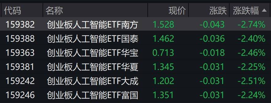 Group 1 - The core viewpoint indicates that AI concept stocks are experiencing a decline, with specific companies like Zhongji Xuchuang and Jingjiawei dropping over 3%, while others such as Xinyi Sheng and Softcom Power fall over 2% [1] - The impact on the market is reflected in the decline of AI-related ETFs on the ChiNext board, which have dropped more than 2% [1] Group 2 - Specific performance data of ChiNext AI ETFs shows that the Southern AI ETF is priced at 1.528, down 2.74%, while the Guotai AI ETF is at 1.462, down 2.40% [2] - Brokerages project that the investment focus in the technology sector will continue to revolve around AI through the second half of 2025, as advancements in large models and explorations by Chinese tech companies in ecosystems and practical applications progress [2]