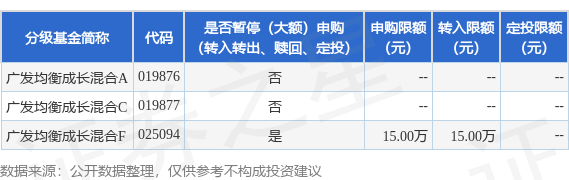 以上内容为证券之星据公开信息整理,由AI算法生成(网信算备310104345710301240019号),不构成 投资建议。 证券之星消息,8月4日广发基金管理有限公司发布《关于广发均衡成长混合型证券投资基金F类基金份 额暂停大额申购(含转换转入、定期定额和不定额投资)业务的公告》。公告中提示,为保护基金份额 持有人利益,自2025年8月5日起广发均衡成长混合型证券投资基金F类基金份额暂停大额申购(含转换 转入、定期定额和不定额投资)业务,下属分级基金调整明细如下: | 分级基金简称 | 代码 | 是否暫停(大额)申购 | | 申购限额 转入限额 定投限额 | | | --- | --- | --- | --- | --- | --- | | | | (转入转出、赎回、定投) | (元) | (元) | (元) | | 广发均衡成长混合A 019876 | | KO | | | | | 广发均衡成长温合C 019877 | | KO | | | | | 广发均衡成长混合F 025094 | | 를 | 15.00万 | 15.00万 | | ...