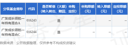 以上内容为证券之星据公开信息整理,由AI算法生成(网信算备310104345710301240019号),不构成 投资建议。 证券之星消息,8月1日广发基金管理有限公司发布《关于广发成长领航一年持有期混合型证券投资基金 调整大额申购(含转换转入、定期定额和不定额投资)业务限额的公告》。公告中提示,为保护基金份 额持有人利益,自2025年8月4日起广发成长领航一年持有期混合型证券投资基金调整大额申购(含转换 转入、定期定额和不定额投资)业务限额,申购、转换转入上限金额为5.0万元,下属分级基金调整明 细如下: | 分级基金简称 | 代码 | 是否暂停(大额)申购 (转入转出、赎回、定投) | 申购限额 转入限额 定投限额 | (元) | | --- | --- | --- | --- | --- | | | | | (元) (元) | | | 广发成长领航一 年持有混合A | 016243 | 를 | | | | 广发成长领航一 年持有混合C | 016244 | 를 | | | ...