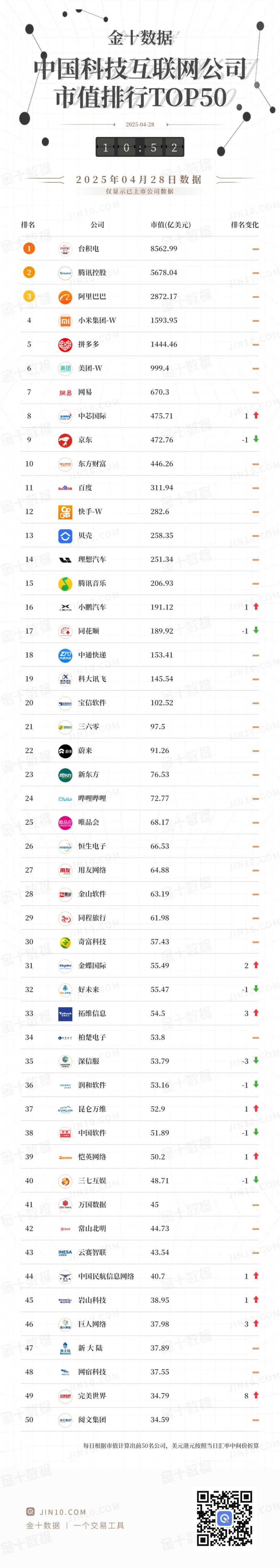 金十图示:2025年04月28日(周一)中国科技互联网公司市值排名TOP 50一览