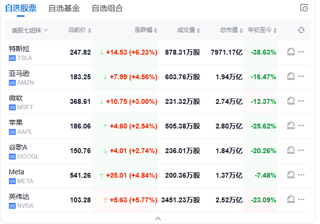 道指涨3.6%,标普500指数涨3.3%。科技股大涨,特斯拉涨约5%,美光科技涨约6%。中概股普涨,京 东涨约5%,哔哩哔哩涨约3%。 | 目选股票 | 自选基金 自选组合 | | | | 16 | | --- | --- | --- | --- | --- | --- | | 美股七姐妹 √ | 当前价 ◆ | 涨跌幅 # | 成交量 # | 总市值 ; 年初至今 ; | 0 | | 特斯拉 | 247.82 | ↓ +14.53 (+6.23%) 878.31万股 | | 7971.17亿 -38.63% | 글 … | | US TSLA | | | | | | | 17马逊 | 183.25 | ↓ +7.99 (+4.56%) 603.76万股 | | 1.94万亿 -16.47% | 를 … | | us AMZN | | | | | | | 微软 | | 368.61 ↓ +10.75 (+3.00%) 231.32万股 | | 2.74万亿 -12.37% | ( = " | | us MSFT | | | | | | | 车首 | 186.06 | ↑ +4.60 (+2.54%) 505. ...