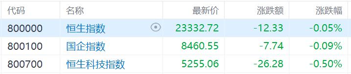 今日,港股三大指数午后震荡回升,尾盘一度全部转涨。 截止收盘,恒生指数、国企指数微幅下跌0.05%及0.09%,恒生科技指数跌0.5%,盘初曾跌超2%,三大指数录得3连跌行情。 | 代码 | 名称 | | 最新价 | 涨跌额 | 涨跌幅 | | --- | --- | --- | --- | --- | --- | | 800000 | 恒生指数 | (0) | 23332.72 | -12.33 | -0.05% | | 800100 | 国企指数 | | 8460.55 | -7.74 | -0.09% | | 800700 | 恒生科技指数 | | 5255.06 | -26.28 | -0.50% | 盘面上,大型科技股涨跌不一,小米涨2.65%,美团涨超2%,腾讯涨超1%,阿里巴巴跌3.4%,百度、快手跌超2%,京东跌1%。 物流企业出口美国报关量大涨,物流股全天强势,尤其是粤港湾控股大涨超26%领衔上涨。 香港新冠病毒活跃程度处于高水平,生物医药股多数走强。 哈尔滨今启动国补家装消费品焕新活动,家电股表现活跃,航空股、水务股、半导体股、电信股、海运股多数上涨。 另一方面,苹果概念股走低,舜宇光学跌 ...
