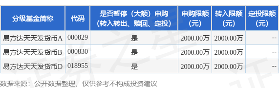 以上内容为证券之星据公开信息整理,由AI算法生成(网信算备310104345710301240019号),不构成 投资建议。 证券之星消息,9月17日易方达基金管理有限公司发布《易方达天天发货币市场基金在非直销销售机构 及直销中心调整机构客户大额申购及大额转换转入业务限制的公告》。公告中提示,为了基金的平稳运 作,保护基金份额持有人利益,自2025年9月18日起易方达天天发货币市场基金在非直销销售机构及直 销中心调整机构客户大额申购及大额转换转入业务限制,下属分级基金调整明细如下: (2)自2025年9月18日起,针对本基金B类基金份额和D类基金份额,基金管理人有权根据保护基金份 额持有人利益的原则全部或部分拒绝机构客户在本公司直销中心的申购或转换转入申请。 | 分级基金简称 | 代码 | 是否暫停(大额)申购 | 申购限额 转入限额 定投限额 | | | --- | --- | --- | --- | --- | | | | (转入转出、赎回、定投) | (元) (元) | (元) | | 易方达大大发货币A 000829 | | 를 | 2000.00万 2000.00万 | | | 易方法天天发货币B ...