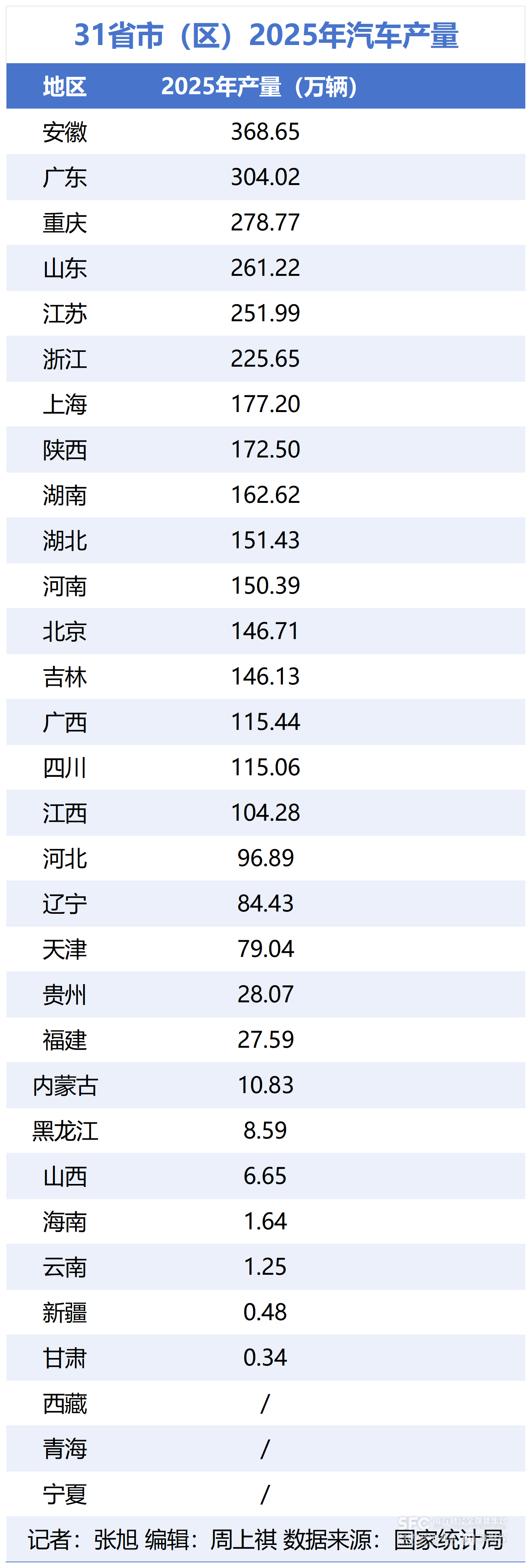 记者丨 张旭 编辑丨周上祺 2025年,中国汽车产业在技术与政策驱动下,经历着深刻变革。国家统计局数据显示,2025 年我国汽车产量达3477.86万辆,同比增长10.2%。 汽车产业作为国民经济的支柱产业,其区域格局的变迁,映射着中国制造业的转型升级之路。 值得注意的是,自2025年起,国家统计局对汽车产量的统计方式发生重要调整,将统计原则从 沿用多年的按"企业法人所在地"改为按"生产地"计算。 以比亚迪为例,比亚迪在外地工厂生 产的汽车,不再计入总部所在地深圳的产量数据,而是计入实际生产地的产量。这一调整使得 汽车产业格局发生了变化。 广东、安徽错位发展 2025年,有16个省份汽车产量突破100万辆,比2024年多出4个(湖南、河南、四川、江 西)。 其中,湖南、河南排名上升幅度较大,前者由第18位跳至第9位,后者由第17位升至第 11位。 新能源时代的到来,也是产业格局变化的重要因素。 中国汽车工业发源地吉林被挤出十强 , 下滑4位排名至第13,2025年汽车产量同比减少3%至146.13万辆,其中新能源汽车18.36万 辆,占比仅12.6%。 华东师范大学城市发展研究院院长曾刚向21世纪经济报道记者 ...