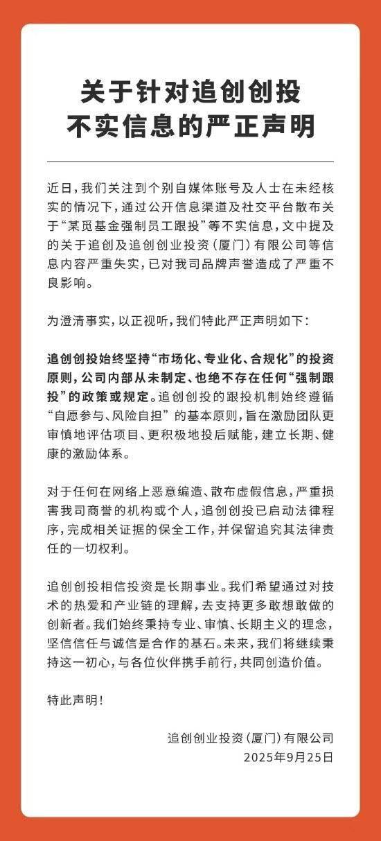 IT之家 9 月 25 日消息,有网络传言近日称追觅科技"强制员工跟投"。对此,追觅旗下追创创投今日澄 清道:公司明确指出,该消息内容失实,追创创投从未制定、也绝不存在任何"强制跟投"的政策或规 定。 IT之家附声明全文: 近日,我们关注到个别自媒体账号及人士在未经核实的情况下,通过公开信息渠道及社交平 台散布关于"某觅基金强制员工跟投"等不实信息,文中提及的关于追创及追创创业投资(厦 门)有限公司等信息内容严重失实,已对我司品牌声誉造成了严重不良影响。 为澄清事实,以正视听,我们特此严正声明如下: 仅 "自愿参与、风险自担"的基本原则,旨在激励团队更 审慎地评估项目、更积极地投后赋能,建立长期、健 康的激励体系。 对于任何在网络上恶意编造、散布虚假信息,严重损 害我司商誉的机构或个人,追创创投已启动法律程 序,完成相关证据的保全工作,并保留追究其法律责 任的一切权利。 追创创投相信投资是长期事业。我们希望通过对技 术的热爱和产业链的理解,去支持更多敢想敢做的 创新者。我们始终秉持专业、审慎、长期主义的理念, 坚信信任与诚信是合作的基石。未来,我们将继续秉 持这一初心,与各位伙伴携手前行,共同创造价值。 追创 ...