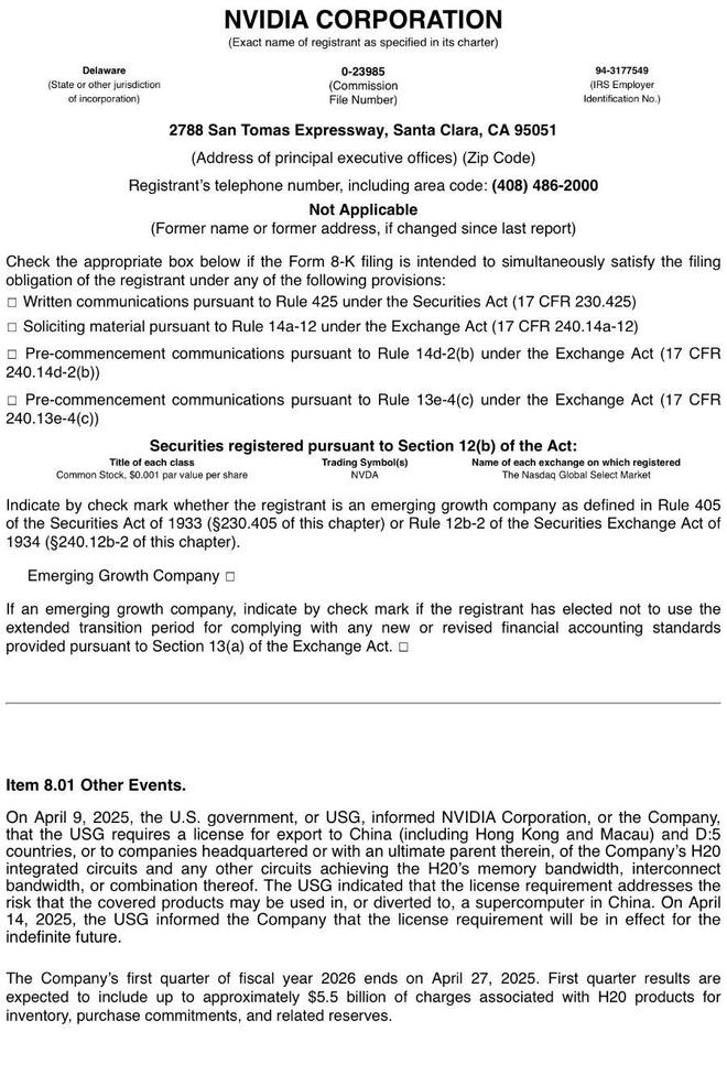 21世纪经济报道记者倪雨晴 深圳报道美国继续收紧AI芯片的出口管制。 据上海证券报报道,当地时间4月15日,英伟达披露,其"特供"中国市场的AI芯片H20已经被美国政府 列入出口管制,需要申请许可证方可出口。英伟达在文件中表示,美国政府已于当地时间4月9日通知英 伟达,要求其向中国(包括香港和澳门)和D:5国家组,或总部或最终母公司位于该地区的企业,出口 H20人工智能加速器和实现H20存储带宽、互连带宽或其组合的任何集成电路都需要获得许可证。英伟 达表示,鉴于H20相关库存及订单等,公司将在2026财年第一季度(截至2025年4月27日)计提约55亿 美元。 IVIDIA CORPORATIC Exact name of registrant as specified Delaware (State or other jurisdiction of incorporation) ammicciar 94-3177549 (IRS Emolover Identification No.) 2788 San Tomas Expressway, Santa Clara, CA 95051 (Address of ...