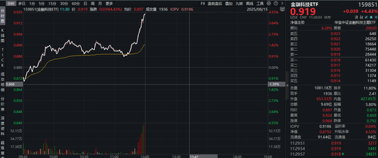 8月15日,互联网金融走强,大智慧涨停,指南针涨超16%,同花顺涨逾14%,财富趋势涨超9%,东方 财富、银之杰等个股大幅跟涨! 热门ETF方面,规模、流动性同类断层第一的金融科技ETF(159851)场内价格半日豪涨4.43%,高 居全市场ETF涨幅第三,全速冲击日线5连阳!成交额超9.69亿元,交投火热! 消息面上,据媒体报道,8月13日参与融资融券交易的投资者数量为52.34万名创年内新高,环比增长 9.67%。融资融券市场活跃度提升显示市场风险偏好增强,支撑高成长板块流动性。 招商证券指出,牛市预期下市场风险偏好走高,且AI+金融也是AI落地的较好场景,继续看好"牛市"旗 手金融科技板块的投资机会。 从中长期投资逻辑来看,金融科技板块弹性十足,对流动性改善反映迅速,目前市场交投活跃度提升明 显,金融科技板块有望持续受益:互联网券商基本面预期有望持续改善,金融IT等作为顺周期高弹性 品种,也持续受益于交易量提振,C端炒股软件景气度向上,B端金融IT需求逐步释放。 多角度把握金融科技机会,建议重点关注金融科技ETF(159851)及其联接基金(013478),标的指数 全面覆盖了互联网券商、金融IT、跨境 ...