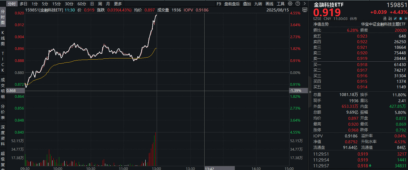 ETF盘中资讯|全市场涨幅第三!半日猛拉4.43%,牛市旗手2.0——金融科技ETF(159851)冲击日线5连阳!