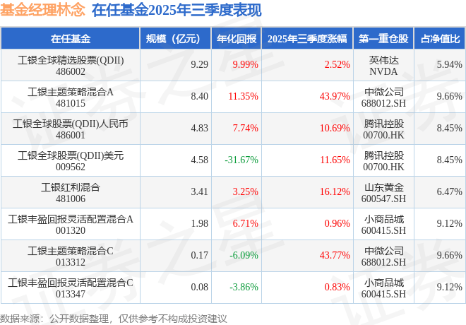 证券之星消息,截止2025年三季度末,基金经理林念旗下共管理8只基金,本季度表现最佳的为工银主题策略混合A(481015),季度净值涨 43.97%。 | 在任基金 | 规模(亿元) | 年化回报 | 2025年三季度涨幅 | 第一重合股 | 白净值比 | | --- | --- | --- | --- | --- | --- | | 工银全球精选股票(QDII) | 9.29 | 9.99% | 2.52% | 英国法 | 5.94% | | 486002 | | | | NVDA | | | 工银丰题策略混合A | 8.40 | 11.35% | 43.97% | 中微公司 | 9.66% | | 481015 | | | | 688012.SH | | | 工银全球股票(QDI)人民币 | 4.83 | 7.74% | 10.69% | 腾讯控股 | 8.45% | | 486001 | | | | 00700.HK | | | 工银全球股票(ODII)美元 | 4.58 | -31.67% | 11.65% | 鹰讯控股 | 8.45% | | 009562 | | | | 00700.HK | | ...