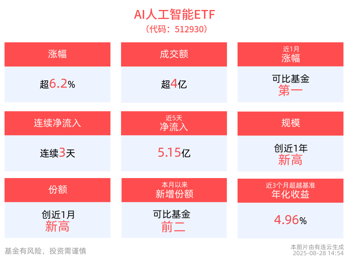 Core Viewpoint - The AI Artificial Intelligence ETF has shown strong performance, closely tracking the CSI Artificial Intelligence Theme Index, which reflects the overall performance of listed companies involved in AI resources, technology, and applications [4][6]. Performance Summary - As of August 28, 2025, the CSI Artificial Intelligence Theme Index increased by 6.27%, with notable gains from component stocks such as Qi Anxin (up 17.95%) and Cambricon (up 14.18%) [3]. - The AI Artificial Intelligence ETF (512930) rose by 6.22%, reaching a latest price of 2.1 yuan, and has accumulated a 12.20% increase over the past week, ranking in the top 25% among comparable funds [3]. Liquidity and Trading Activity - The AI Artificial Intelligence ETF experienced a turnover rate of 17.57% during trading, with a transaction volume of 488 million yuan, indicating active market participation [3]. - The average daily trading volume for the AI Artificial Intelligence ETF over the past week was 307 million yuan [3]. Fund Size and Fees - The latest size of the AI Artificial Intelligence ETF reached 2.702 billion yuan, marking a new high in the past year [3]. - The management fee for the AI Artificial Intelligence ETF is 0.15%, and the custody fee is 0.05%, which are the lowest among comparable funds [3]. Tracking Accuracy - As of August 27, 2025, the AI Artificial Intelligence ETF had a tracking error of 0.006% over the past month, indicating the highest tracking precision among comparable funds [3]. Index Composition - The CSI Artificial Intelligence Theme Index consists of 50 listed companies that provide foundational resources, technology, and application support for AI, with the top ten weighted stocks accounting for 55.52% of the index [4]. - The top ten stocks by weight include Zhongji Xuchuang (6.71%), Xinyi Sheng (6.52%), and Cambricon (6.45%) [6].