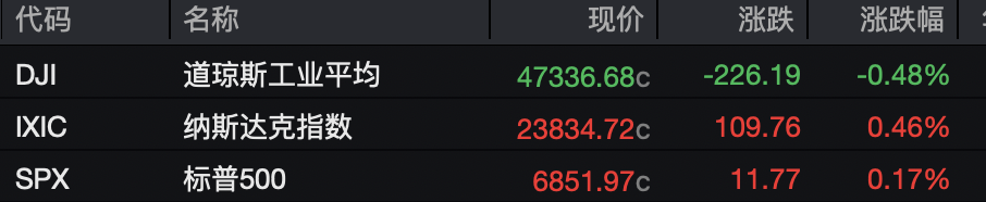美联储官员密集发声。 当地时间11月3日(周一),美股三大指数涨跌不一,纳指涨0.46%,标普500指数涨0.17%,道指跌0.48%。亚马逊与OpenAI签署 380亿美元算力供应协议的消息推动公司股价走高,刷新历史纪录。 | 代码 | 名称 | 现价 | 涨跌 | 涨跌幅 | | --- | --- | --- | --- | --- | | DJI | 道琼斯工业平均 | 47336.68c | -226.19 | -0.48% | | IXIC | 纳斯达克指数 | 23834.72c | 109.76 | 0.46% | | SPX | 标普500 | 6851.97c | 11.77 | 0.17% | 当天,多位美联储官员对降息前景发表看法。美联储理事库克表示,12月有可能降息,但将取决于后续新出炉的信息;美联储理 事斯蒂芬·米兰则公开呼吁进行更激进的降息;美联储官员古尔斯比却认为,12月降息的门槛高于10月。 投资者同时密切关注华盛顿动态,目前美国政府仍处于"停摆"状态。此次"停摆"已导致包括月度非农就业报告在内的多项关键经 济数据推迟发布。 在上周与微软签署重组协议后,OpenAI掌门奥特曼 ...
