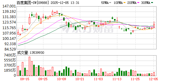 (文章来源:每日经济新闻) 每经AI快讯,12月5日,港股百度午后直线拉升涨超6%。 ...