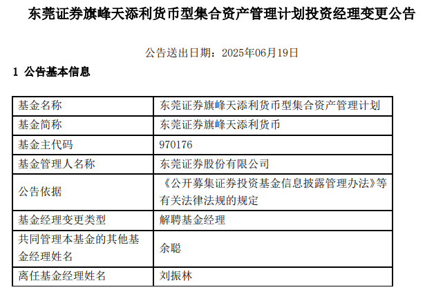 | 基金名称 | 东莞证券旗峰天添利货币型集合资产管理计划 | | --- | --- | | 基金简称 | 东莞证券旗峰天添利货币 | | 基金主代码 | 970176 | | 基金管理人名称 | 东莞证券股份有限公司 | | 公告依据 | 《公开募集证券投资基金信息披露管理办法》等 | | | 有关法律法规的规定 | | 基金经理变更类型 | 解聘基金经理 | | 共同管理本基金的其他基 | 美聪 | | 金经理姓名 | | | 离任基金经理姓名 | 刘振林 | (责任编辑:李荣) 中国经济网北京6月19日讯 今日,东莞证券股份有限公司公告称,刘振林离任东莞证券旗峰天添利 货币(970176)。 刘振林离任原因为工作调整,拟聘任为小集合资产管理计划投资经理。 东莞证券旗峰天添利货币成立于2022年8月26日,截至2025年6月18日,其成立来收益率为3.00%。 截至2025年3月31日,该基金规模32.52亿元。 ...