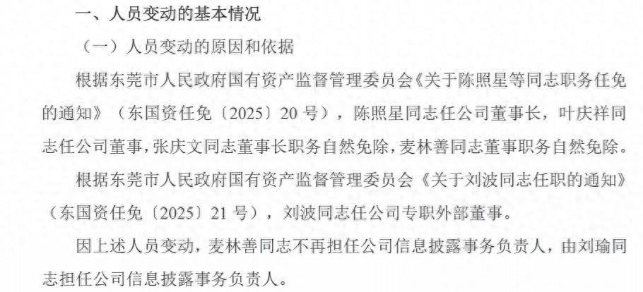 瑞财经 王敏 8月13日,东莞市投资控股集团有限公司发布关于董事长、总经理、董事及信息披露事务负责人变动事项。 根据东莞市国资委相关通知,陈照星任东莞投资集团董事长,叶庆祥任该公司董事,张庆文董事长职务自然免除,麦林善董事职 务自然免除。 据悉,新任东莞投资集团董事长陈照星,目前为东莞证券党委书记、董事长,此番属于升任股东单位董事长。 陈照星,男,1975年1月生,本科学士,现任东莞市投资控股集团有限公司党委书记、董事长,东莞证券股份有限公司党委书 记、董事长。 陈照星曾任东莞证券有限责任公司董事会秘书、办公室主任、总裁助理、党委委员、总经理助理、副总经理、总经理、党委副书 记、深圳分公司总经理;华联期货有限公司总经理董事长;东莞证券股份有限公司党委副书记、总经理。 另一则公告显示,东莞投资集团刚刚由东莞金融控股集团更名而来,东莞金融控股集团是东莞证券持股比例最高的股东,持有东 莞证券32.9%股份。 东莞投资集团表示,本次公司名称变更不改变原签署的与公司债券相关的法律文件效力,公司更名前的债权债务关系均由更名后 的公司继承,原签署的相关法律文件对已发行的公司债券继续具有法律效力,不再另行签署新的法律文件。 ...