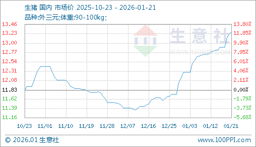 01月21日生猪13.27元/公斤 30天上涨14.59%