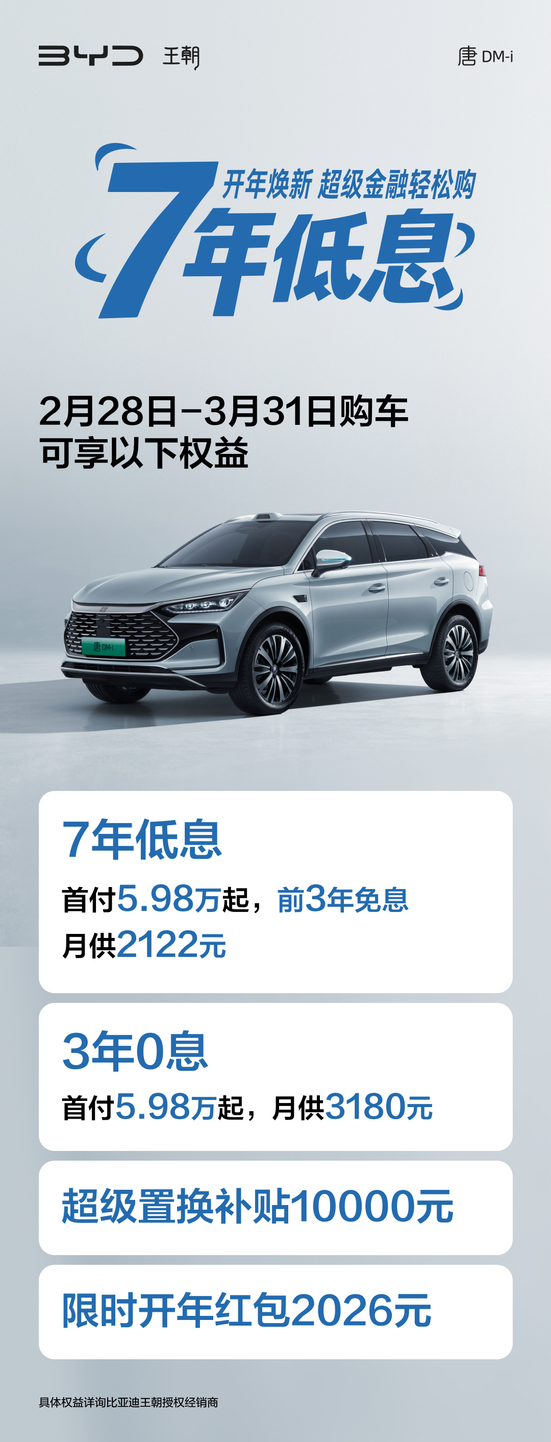 7年低息 首付5.98万起,前3年免息 月供2122元 3年0息 首付5.98万起,月供3180元 超级置换补贴10000元 限时开年红包2026元 IT之家 3 月 1 日消息,比亚迪今日公布汉唐家族开年专属福利,首付 5.98 万元起,提供 3 年 0 息、7 年低息方案,活动时间 2 月 28 日-3 月 31 日。 2 月 28 日-3 月 31 日购车可享以下权益: 7年低息 首付5.98万起,前3年免息 具体权益详询比亚迪王朝授权经销商 BLHD 王朝 18 开年焕新 超级金融轻松购 FIFA . 2月28日-3月31日购车 可享以下权益 IT之家注意到,比亚迪昨日还公布了秦 PLUS 史上最强金融政策(3 月 31 日截止): 此外,截至 3 月 31 日(含),元 UP 享超级置换补贴 5000 元,综合补贴后 6.98 万元起。 ...