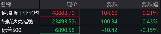 12月12日,美股三大指数开盘走势分化,道指涨0.21%刷新历史高位;纳指低开0.43%,标普500指 数低开0.15%。 博通跌超7%;甲骨文跌超1%,此前一交易日下跌近11%。英伟达涨0.4%。 编辑丨瑜见 | 名称 | 现价 | 涨跌 | 涨跌幅 | | --- | --- | --- | --- | | 道琼斯工业平均 | 48808.70 | 104.69 | 0.21% | | 纳斯达克指数 | 23493.52 c | -100.34 | -0.43% | | 标普500 | 6890.58 | -10.42 | -0.15% | 热门中概股多数上涨,纳斯达克中国金龙指数涨0.6%,网易涨超3%,蔚来涨超2%,小鹏汽车、理想 汽车涨超1%。 ...