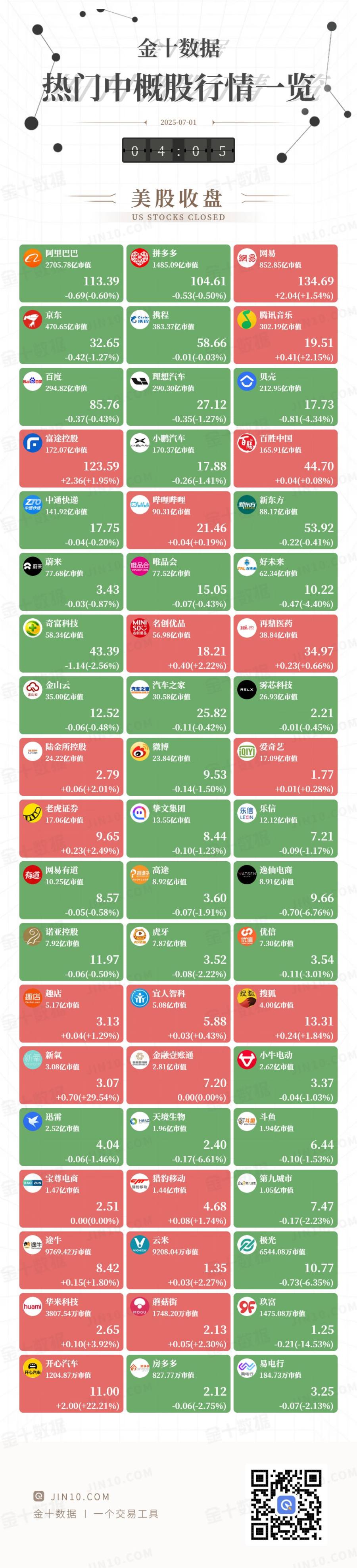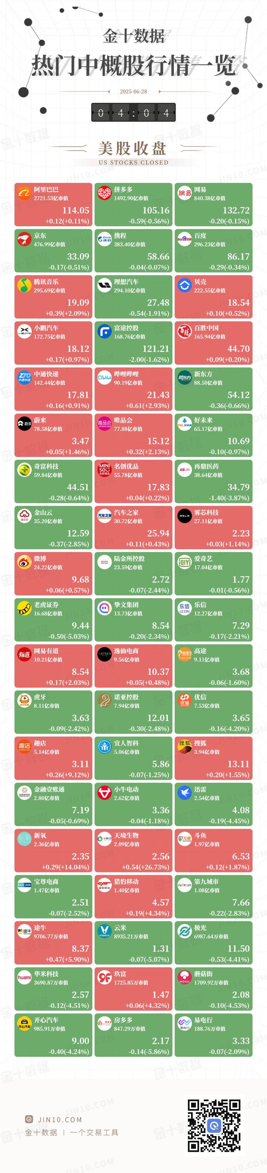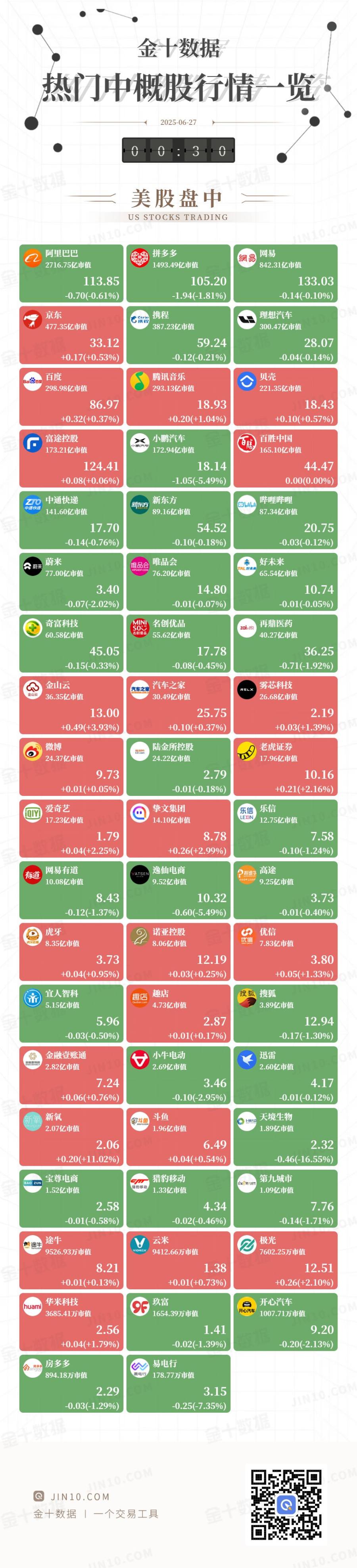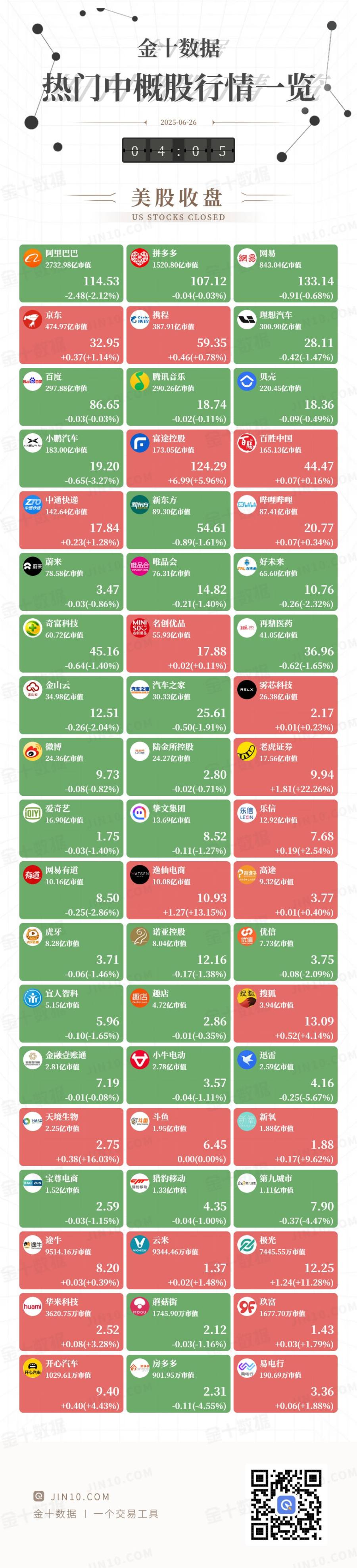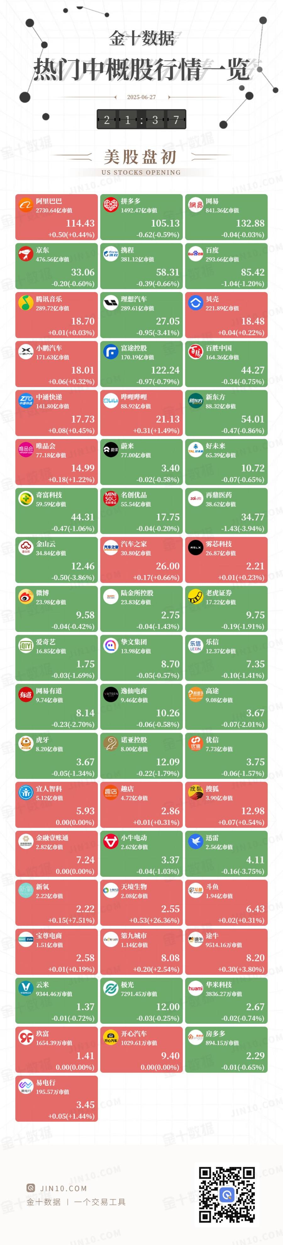 @ JIN10.COM 金十数据 | 一个交易工具 UNIO.COM UNIO.COM IN 10.COM 金十图示:2025年06月26日(周四)热门中概股行情一览(美股盘中) 141.60亿市值 89.16亿市值 87.34亿市值 17.70 54.52 20.75 -0.14(-0.76%) -0.10(-0.18%) -0.03(-0.12%) 蔚来 TALHAR TALEAN TALEAN T 唯品会 唯品会 会 蔚来 76.20亿市值 65.54亿市值 77.00亿市值 14.80 10.74 3.40 -0.07(-2.02%) -0.01(-0.07%) -0.01(-0.05%) 再鼎医药 | 奇富科技 so 名创优品 zai 60.58亿市值 55.62亿市值 40.27亿市值 45.05 17.78 36.25 -0.15(-0.33%) -0.08(-0.45%) -0.71(-1.92%) 雾芯科技 金山区 == 36.35亿市值 30.49亿市值 26.68亿市值 25.75 2.19 13.00 +0.49(+3.93%) +0.10(+0.37%) +0.03(+1.39%) ...