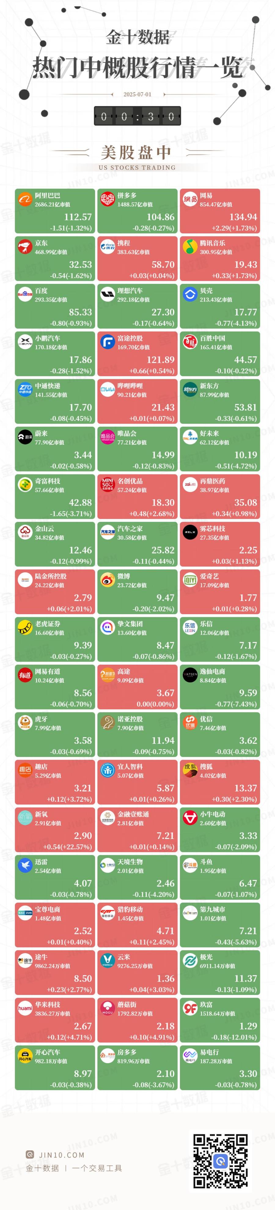 金十图示:2025年06月30日(周一)热门中概股行情一览(美股盘中)
