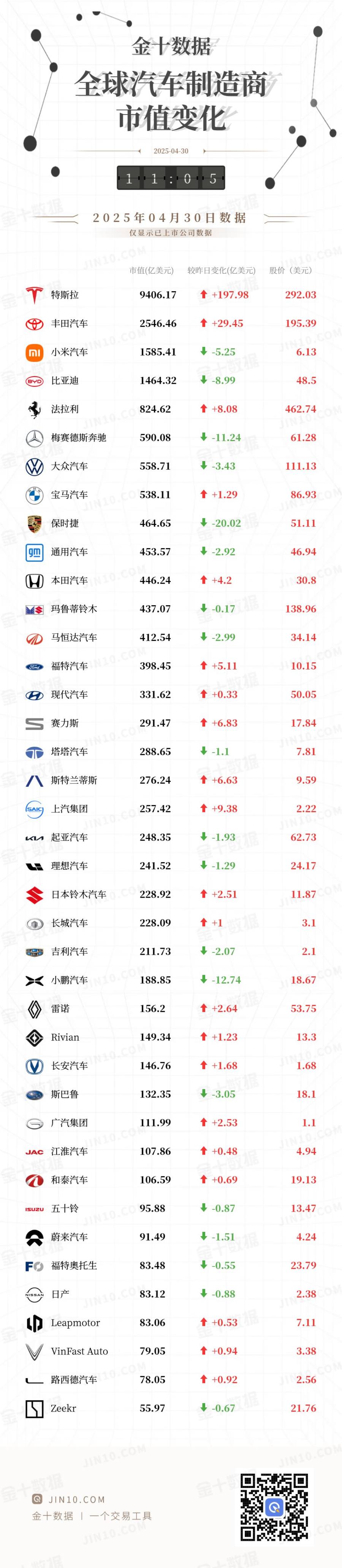 金十图示:2025年04月30日(周三)全球汽车制造商市值变化 SE @ JIN10.COM 金十数据 | 一个交易工具 JIN10.COM t with and and and and the comment | 宝马汽车 | 538.11 | 1 +1.29 | 86.93 | | --- | --- | --- | --- | | 保时捷 | 464.65 | + -20.02 | 51.11 | | 通用汽车 | 453.57 | + -2.92 | 46.94 | | 本田汽车 1-0 | 446.24 | 1 +4.2 | 30.8 | | MS 玛鲁蒂铃木 | 437.07 | + -0.17 | 138.96 | | 马恒达汽车 S | 412.54 | + -2.99 | 34.14 | | 福特汽车 | 398.45 | 1 +5.11 | 10.15 | | 19 现代汽车 | 331.62 | 1 +0.33 | 50.05 | | F 赛力斯 | 291.47 | 1 +6.83 | 17.84 | | 塔塔汽车 | 288.65 | + -1.1 | 7.81 | | 斯特兰蒂斯 ...
