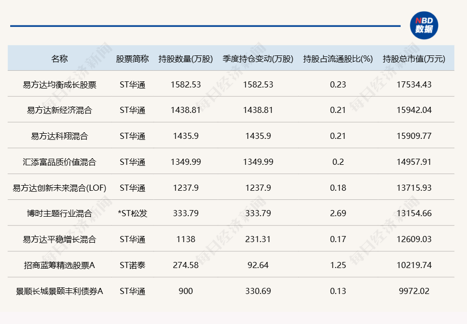 Core Viewpoint - The public fund's second quarter report reveals a significant number of funds heavily invested in stocks under risk warning, indicating a trend of new investments in these stocks during the quarter [1][2][3]. Group 1: Fund Holdings and Performance - As of the end of the second quarter, 133 funds are reported to have heavy holdings in risk warning stocks, including ST Huatuo, ST Nuotai, *ST Songfa, and *ST Chengchang [1][2]. - Specifically, 100 funds are heavily invested in ST Huatuo, with notable holdings exceeding 10 million shares from several funds, including E Fund Balanced Growth Stock and E Fund New Economy Mixed [2]. - The second quarter performance of these risk warning stocks was generally strong, with ST Huatuo, *ST Songfa, and *ST Chengchang showing increases of 72.32%, 18.38%, and 32.59% respectively [3]. Group 2: Fund Company Involvement - A total of 25 fund companies have products that are heavily invested in the aforementioned risk warning stocks, with Bosera Fund and E Fund having the highest number of products involved [2]. - Notably, Bosera Fund has 25 products invested, while E Fund has 24 products in these stocks [2]. Group 3: Regulatory and Valuation Adjustments - Some fund managers have made valuation adjustments for the stocks they hold, while others assert that their investments comply with legal and company regulations [1][6]. - For instance, on July 22, 2023, a fund company announced a valuation adjustment for ST Nuotai, reflecting the ongoing regulatory scrutiny and the need for compliance [6]. Group 4: Market Sentiment and Future Outlook - There is a mixed sentiment in the industry regarding the investment in risk warning stocks, with some analysts suggesting that certain stocks may not significantly impact the main business despite their warnings [7]. - The current environment presents challenges for capital operations in risk warning stocks, as regulatory scrutiny has increased, making it difficult for companies to achieve profitable exits [7].