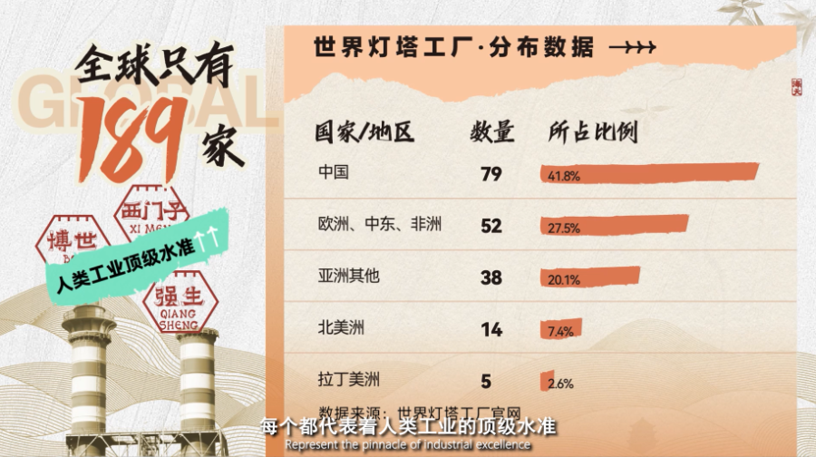 你可能听说过"灯塔工厂" 是"世界上最先进的工厂"才会得到的荣誉 全球只有189家 博世、强生、西门子...... 每个都代表着人类工业的顶级水准 成为全球唯——家酱油酿造行业上榜企业 酱油 这个词最早来自南宋时期的《山家清供》 这味发源于中国的神秘东方调料 在岁月长河中沉淀为中华饮食文化的标识 1955年,佛山25家古酱园重组合并 有了后来的"海天酱油厂" | 全球只是 | | 世界灯塔工厂·分布数据 | 1 | | --- | --- | --- | --- | | | 国家/她区 | 数量 | 所占比例 | | | 中国 | 79 | 41.8% | | | 欧洲、中东、非洲 | 52 | 27.5% | | | 亚洲其他 | 38 | 20.1% | | | 北美洲 | 14 | 7.4% | | | 拉丁美洲 | 5 | 2.6% | 2025年1月14日 这批名单有了17家新成员 其中,海天味业旗下的佛山高明工厂也入选了 但如今的海天已不是传统酱园工坊 走进海天生产基地 面积60万平方米的天然晒池 数十米高的不锈钢发酵罐 总仓储能力超过500万吨的立体仓库 生产着年产值超过200亿元的调味品产品 ...
