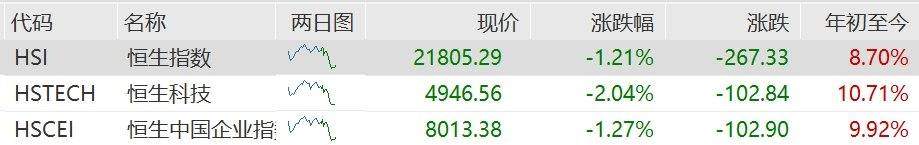 (责任编辑:宋政 HN002) 格隆汇4月24日|美股虽然连续两天出现报复式反弹,但从昨日尾盘走势来看明显后劲不足。美国总统 特朗普最新表示,新的对华关税税率可能会在未来两到三周出台。 | 代码 | 名称 | 两日图 | 现价 | 涨跌幅 | 涨跌 | 年初至今 | | --- | --- | --- | --- | --- | --- | --- | | H2I | 恒生指数 | ma | 21805.29 | -1.21% | -267.33 | 8.70% | | HSTECH | 恒生科技 | Vin | 4946.56 | -2.04% | -102.84 | 10.71% | | HSCEI | 相生中国人们指:人人 | | 8013.38 | -1.27% | -102.90 | 9.92% | 昨日强势的机器人概念股今日集体回调,其中,地平线机器人首阶段禁售期结束,股价跌6%,越疆、 优必选跌超3%。 器日其他个股方面,京东跌超5%,美团跌超4%,华虹半导体、快手、比亚迪(002594)电子跌超3%,阿 里跌超2%,腾讯跌1%。 港股三日飙逾千点后,今日上午低开低走,盘中曾出现跳水走势。截至半 ...