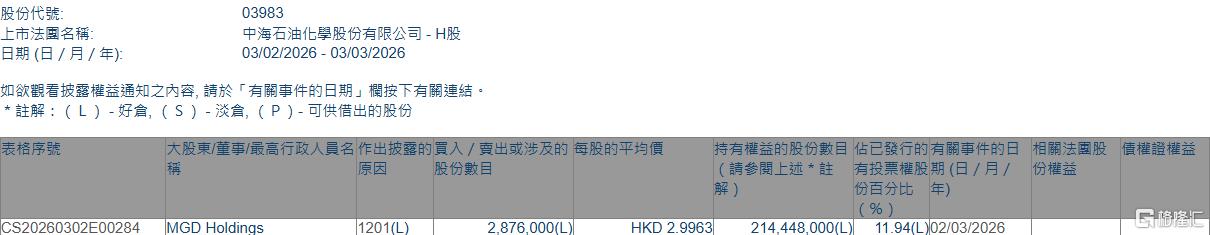 减持后,MGD Holdings最新持股数目为214,448,000股,持股比例由12.10%下降至11.94%。 | 股份代號: | 03983 | | --- | --- | | 上市法國名稱: | 中海石油化學股份有限公司 - H股 | | 日期 (日 / 月 / 年): | 03/02/2026 - 03/03/2026 | 格隆汇3月3日丨根据联交所最新权益披露资料显示,2026年3月2日,中海石油化学(03983.HK)遭MGD Holdings在场内以每股均价2.9963港元减持287.6万 股,涉资约861.74万港元。 | 表格序號 | 大股東/董事/最高行政人員名 作出披露的買入 / 賣出或涉及的 每股的平均價 | | | | 持有權益的股份數目 佔已發行的有關事件的日 相關法國 | | --- | --- | --- | --- | --- | --- | | | 股份數目 | 原因 | | | (詩参関上述* 註 有投票權股期 (日 / 月 / 份權益 | | | | | | | 一篇 份百分比 年) | | | | | | | 9/0 | | CS20260302E00284 | I ...