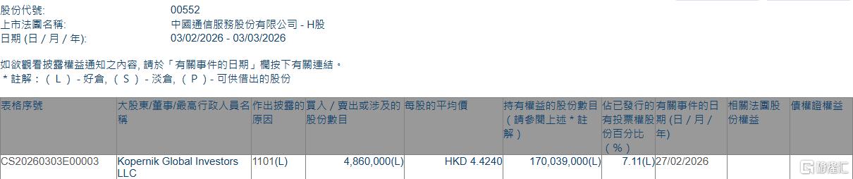 | 股份代號: | 00552 | | --- | --- | | 上市法國名稱: | 中國通信服務股份有限公司 - H股 | | 日期 (日 / 月 / 年): | 03/02/2026 - 03/03/2026 | 格隆汇3月3日丨根据联交所最新权益披露资料显示,2026年2月27日,中国通信服务(00552.HK)获Kopernik Global Investors LLC在场内以每股均价4.424港元 增持486万股,涉资约2150.1万港元。 增持后,Kopernik Global Investors LLC最新持股数目为170,039,000股,持股比例由6.91%上升至7.11%。 | 表格序號 | 大股東/董事/最高行政人員名 作出披露的買入 / 費出或涉及的 每股的平均價 | | | | 持有權益的股份數目 佔已發行的有關事件的日 相關法國 | | --- | --- | --- | --- | --- | --- | | | 泉因 | 股份數目 | | | (請参閱上述*註 有投票權股期(日/月/ 份權益 | | | | | | | 份自分比 年) | | PRODUCTION CONSU ...