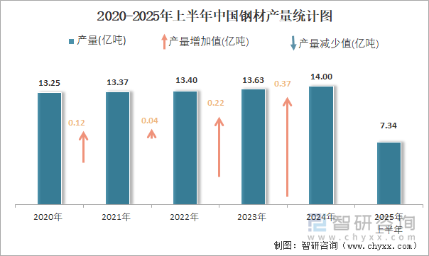 2025年上半年中国钢材产量为7.3亿吨 累计增长4.6%