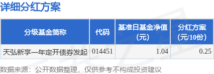 证券之星消息,11月6日发布《天弘新享一年定期开放债券型发起式证券投资基金分红公告》。本次分 红为2025年度的第1次分红。公告显示,本次分红的收益分配基准日为10月10日,详细分红方案如下: | 分级基金简称 代码 | 電准日電金浄值 | 分红方案 | | | --- | --- | --- | --- | | | (元) | (元/10份) | | | 天弘新字一年定开债券发起 014451 | | 1.04 | 0.25 | 本次分红对象为权益登记日在基金注册登记机构登记在册的本基金全体基金份额持有人。,权益登记日 为11月7日,现金红利发放日为11月10日。选择红利再投资方式的投资者,其红利按2025年11月07日除 息后的基金份额净值转换为基金份额,转换后的基金份额将于2025年11月10日直接计入其基金账户, 2025年11月11日起可以查询。根据相关法律法规规定,基金向投资者分配的基金收益,暂免征收所得 税。本基金本次分红免收分红手续费;选择红利再投资方式的投资者其红利再投资所得的基金份额免收 申购费用。 以上内容为证券之星据公开信息整理,由AI算法生成(网信算备3101043457103012 ...