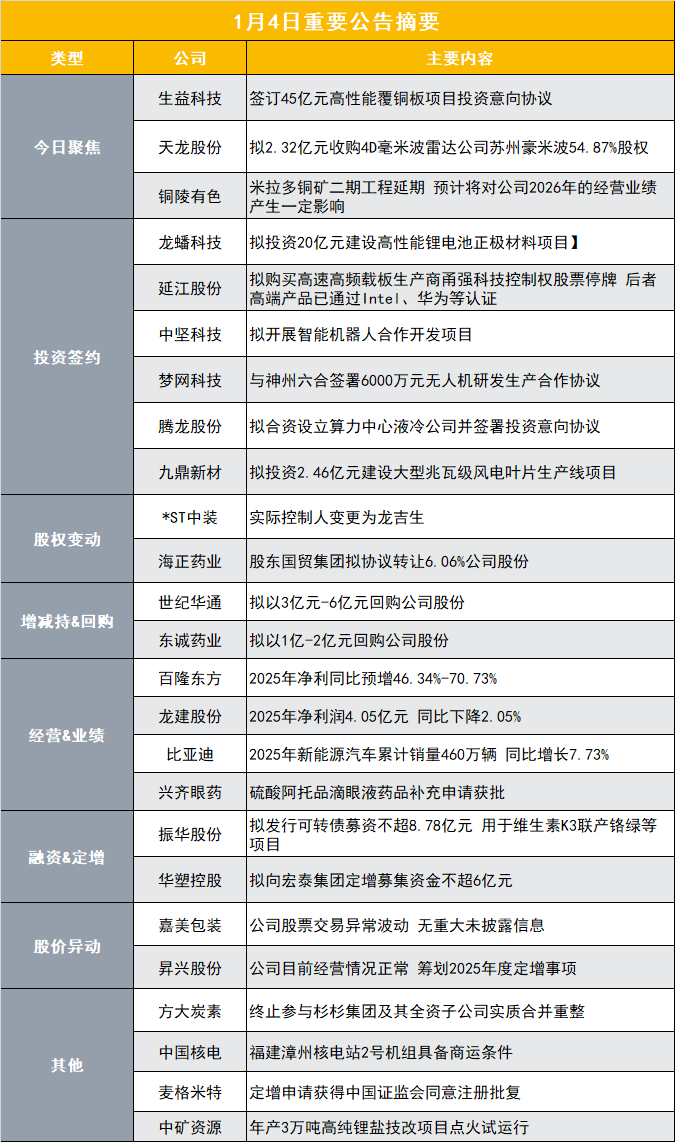 登录新浪财经APP 搜索【信披】查看更多考评等级 | | | 1月4日重要公告摘要 | | --- | --- | --- | | 类型 | 公司 | 主要内容 | | 今日聚焦 | 生益科技 | 签订45亿元高性能覆铜板项目投资意向协议 | | | 天龙股份 | 拟2. 32亿元收购4D毫米波雷达公司苏州豪米波54. 87%股权 | | | 铜陵有色 | 米拉多铜矿二期工程延期 预计将对公司2026年的经营业绩 产生一定影响 | | 投资签约 | 龙蟠科技 | 拟投资20亿元建设高性能锂电池正极材料项目】 拟购买高速高频载板生产商甬强科技控制权股票停牌 后者 高端产品已通过Intel、华为等认证 | | | 延江股份 | | | | 中坚科技 | 拟开展智能机器人合作开发项目 | | | 梦网科技 | 与神州六合签署6000万元无人机研发生产合作协议 | | | 鹰龙股份 | 拟合资设立算力中心液冷公司并签署投资意向协议 | | | 九鼎新材 | 拟投资2.46亿元建设大型兆瓦级风电叶片生产线项目 | | 股权变动 | *ST中装 | 实际控制人变更为龙吉生 | | | 海正药业 | 股东国贸集团拟协议转让 ...