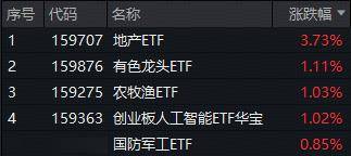 A股今日(12月10日)下探回升,三大指数涨跌不一。截至收盘,沪指跌0.23%,险守3900点;深证成 指涨0.29%,创业板指跌0.02%。沪深两市全天成交额1.78万亿元,较昨日缩量超1200亿元。 盘面上,地产午后直线上攻,全市场唯一跟踪中证800地产指数的地产ETF(159707)收涨3.73%领涨全 市场;有色金属板块逆市活跃,揽尽有色金属行业龙头的有色龙头ETF(159876)场内价格劲涨 1.11%;农牧渔板块掀涨停潮,全市场唯一农牧渔ETF(159275)场内价格大涨1.03%;AI产业链继续上 攻,光模块CPO含量超56%的创业板人工智能ETF华宝(159363)再刷上市新高;商业航天概念反复活 跃,高人气国防军工ETF(512810)场内收涨0.85%,收盘价创近一个月新高。 | 序号 代码 名称 | 涨跌幅▼ | | --- | --- | | 1 159707 地产ETF | 3.73% | | 2 159876 有色龙头ETF | 1.11% | | 3 | 1.03% | | 4 159363 创业板人工智能ETF华宝 1.02% | | | 5 512810 国防军工ETF | ...
