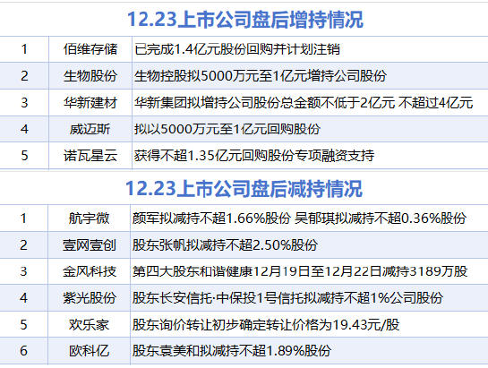 | 1 | 航宇微 | 颜军拟减持不超1.66%股份 吴郁琪拟减持不超0.36%股份 | | --- | --- | --- | | 2 | 壹网壹创 | 股东张帆拟减持不超2.50%股份 | | 3 | 全风科技 | 第四大股东和谐健康12月19日至12月22日减持3189万股 | | র্য | 案并股份 | 股东长安信托·中保投1号信托拟减持不超1%公司股份 | | 5 | 欢乐家 | 股东询价转让初步确定转让价格为19.43元/股 | | 6 | 欧科亿 | 股东袁美和拟减持不超1.89%股份 | | 1 | 佰维存储 已完成1.4亿元股份回购并计划注销 | | --- | --- | | 2 | 生物股份 生物控股拟5000万元至1亿元增持公司股份 | | 3 | 华新建材 华新集团拟增持公司股份总金额不低于2亿元 不超过4亿元 | | র্ব | 威迈斯 拟以5000万元至1亿元回购股份 | | 5 | 诺瓦星云 获得不超1.35亿元回购股份专项融资支持 | 据统计,12月23日,盘后佰维存储、生物股份、华新建材、威迈斯、诺瓦星云披露增持情况。包括航宇 微、壹网壹创、金风科技、紫光股份、欧科亿、欢 ...