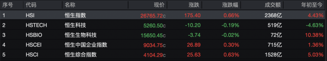 【导读】2月25日,港股大模型股集体大跌 2月25日,港股三大指数涨跌不一。截至收盘,恒生指数涨0.66%,报26765.72点;恒生科技指数跌0.19%,报5260.50点;恒生国企指数涨0.30%,报 9034.75点。全日大市成交额为2368亿港元,南向资金净卖出40.57亿港元。 | 序号 | 代码 | 名称 | 现价 | 涨跌 | 涨跌幅 | 成交额 | 年初至今 | | --- | --- | --- | --- | --- | --- | --- | --- | | 1 | HSI | 恒生指数 | 26765.72c | 175.40 | 0.66% | 2368亿 | 4.43% | | 2 | HSTECH | 恒生科技 | 5260.50c | -10.20 | -0.19% | 519亿 | -4.63% | | 3 | HSBIO | 恒生生物科技 | 15650.45c | -3.74 | -0.02% | 72亿 | 10.38% | | 4 | HSCEI | 恒生中国企业指数 | 9034.75c | 26.89 | 0.30% | 715亿 | 1.36% | | 5 | ...