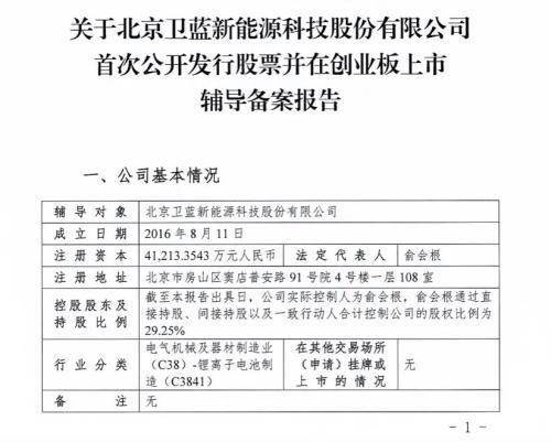 作者丨孙媛 又一独角兽,正式启动IPO进程。 12月11日,证监会网站披露,北京卫蓝新能源科技股份有限公司(简称:卫蓝新能源)启动A股IPO并 提交辅导备案,公司拟在创业板上市,辅导机构为中信建投。 | 辅导对象 | 北京卫蓝新能源科技股份有限公司 | | --- | --- | | 新 成立日 | 2016年8月11日 | | 注册资本 | 41,213.3543 万元人民币 法 定 代 表 人 偷会根 | | 注 费 地 | 北京市房山区襄店書安路 91 号院 4 号楼一层 108 室 | | 控股股东及 持 股 比 例 | 截至本报告出具日,公司实际控制人为禽会根,禽会根遮过直 接持股、间接持股以及一致行动人合计控制公司的股权比例为 29.25% | | 行业分类 | 申气机械及暴材刷造业 在其他交易场所 (申请)挂牌或 无) | | | (C38)-锂离于电池制 | | | 造(C3841) 上市的情况 | | 各 注 | 元 | 来源:证监会 作为国内固态电池领域头部企业,卫蓝新能源与背靠上汽集团的清陶能源有"北卫蓝、南清陶"之称。 自2017年起,公司便获得多轮投资,其中,2022年D轮融资就融了 ...