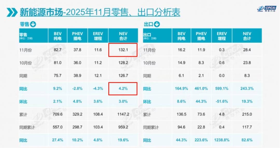 乘联分会最新数据显示,11月国内新能源乘用车市场零售量为132.1万辆,同比增长4.2%,新能源市场零售渗透率达到59.3%。 | 電量(4) | | | | | HOG | | | | | | --- | --- | --- | --- | --- | --- | --- | --- | --- | --- | | 零售 (母位: 万吨) | BEV | PHEV | EREV | NEV | HD | BEV | PHEV | EREV | NEV | | | संक्री | 播电 | 增程 | 음난 | (单位:万辆) | 纯电 | 摘电 | 增程 | 合计 | | 11月份 | 82.7 | 37.8 | 11.6 | 132.1 | 11月份 | 16.2 | 11.9 | 0.3 | 28.4 | | 10月份 | 81.0 | 36.0 | 11.2 | 128.2 | 10目份 | 14.9 | 8.3 | 0.6 | 23.8 | | 同期 | 75.7 | 38.9 | 12.1 | 126.7 | 同期 | 6.1 | 2.1 | 0.0 | 8.3 | | 同比 | 9.2% | - ...