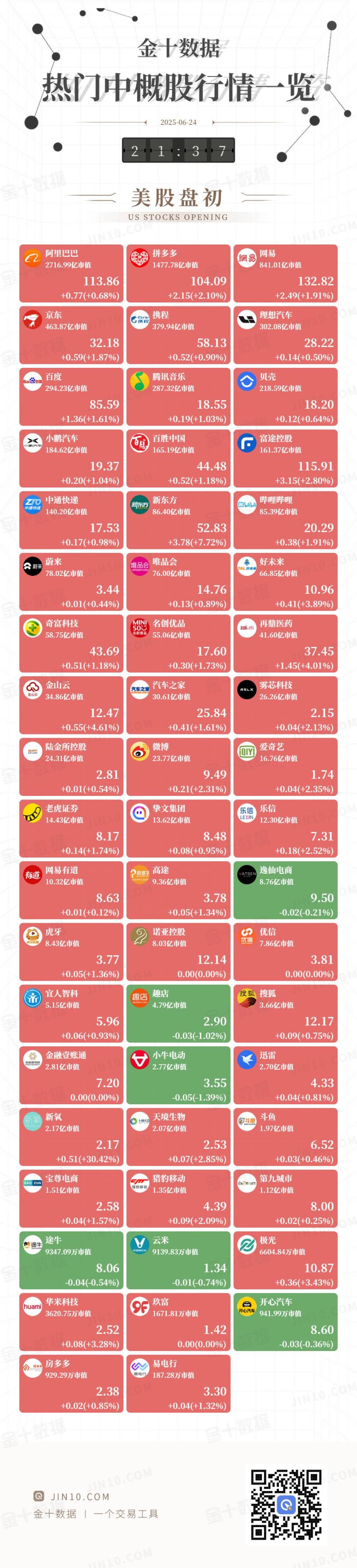 金十图示:2025年06月24日(周二)热门中概股行情一览(美股盘初)