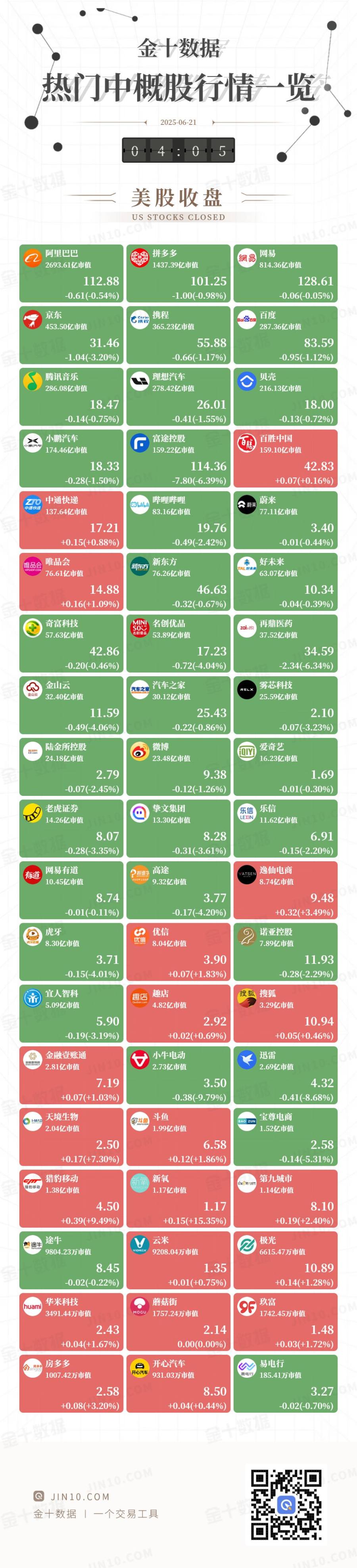金十图示:2025年06月20日(周五)热门中概股行情一览(美股收盘) 137.64亿市值 83.16亿市值 77.11亿市值 17.21 19.76 3.40 +0.15(+0.88%) -0.49(-2.42%) -0.01(-0.44%) 新东方 TALEA 好未来 唯品会 唯品会 葡萄方 63.07亿市值 76.61亿市值 76.26亿市值 14.88 10.34 46.63 +0.16(+1.09%) -0.32(-0.67%) -0.04(-0.39%) 再鼎医药 | 奇富科技 so 名创优品 zai 57.63亿市值 53.89亿市值 37.52亿市值 42.86 17.23 34.59 -0.20(-0.46%) -0.72(-4.04%) -2.34(-6.34%) 雾芯科技 金山云 =2 汽车之家 RELX 32.40亿市值 25.59亿市值 30.12亿市值 11.59 25.43 2.10 -0.49(-4.06%) -0.22(-0.86%) -0.07(-3.23%) 陆金所控股 ian 爱奇艺 n som 16.23亿市值 24.18亿市值 23.48亿市值 2.79 9.38 ...