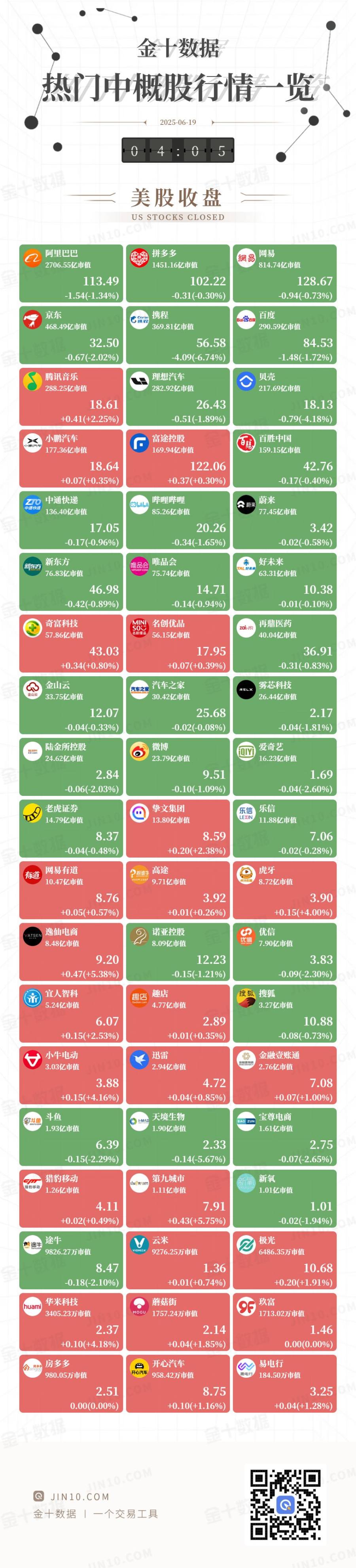 金十图示:2025年06月20日(周五)热门中概股行情一览(美股收盘)