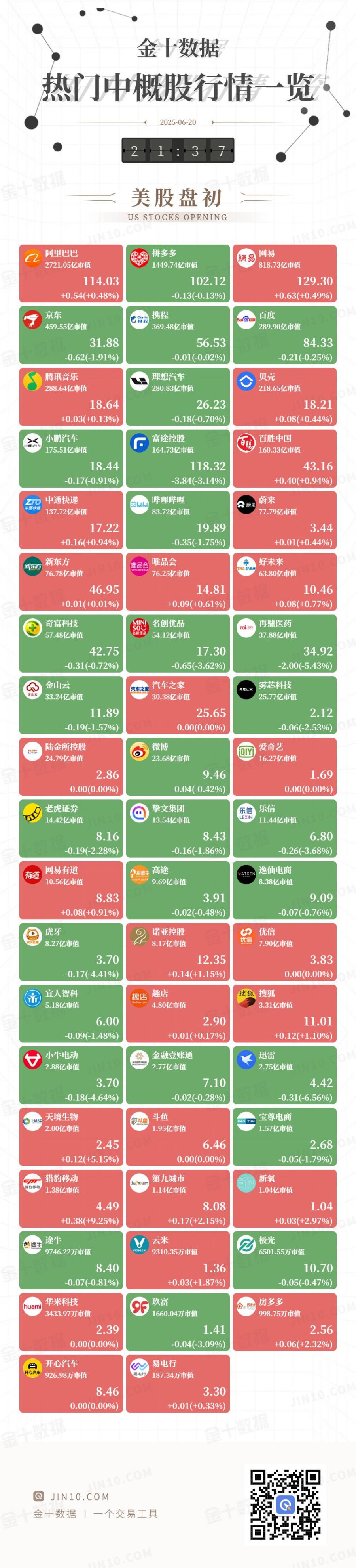 金十图示:2025年06月20日(周五)热门中概股行情一览(美股盘中) 137.68亿市值 83.70亿市值 77.34亿市值 17.21 19.89 3.42 +0.15(+0.91%) -0.36(-1.78%) -0.01(-0.15%) 新东方 TALHAR 好未来 唯品会 唯品会 葡萄方 64.02亿市值 76.64亿市值 76.63亿市值 14.88 10.49 46.86 +0.17(+1.12%) -0.09(-0.19%) +0.12(+1.11%) 再鼎医药 | 奇富科技 so 名创优品 zai 57.52亿市值 54.01亿市值 37.68亿市值 42.77 17.27 34.74 -0.28(-0.66%) -2.19(-5.93%) -0.69(-3.82%) 雾芯科技 金山云 =2 汽车之家 RELX 26.01亿市值 32.71亿市值 30.17亿市值 11.70 25.47 2.13 -0.18(-0.70%) -0.38(-3.15%) -0.04(-1.61%) 陆金所控股 ion) 爱奇艺 t 60 2011 16.37亿市值 24.57亿市值 23.61亿市值 2.83 ...