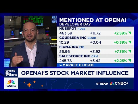 Let's stick with this story. Check out the pop in shares of HubSpot, Salesforce, Figma, Corsera, all mentioned on stage at OpenAI's Dev Day as partners. So, what does all that mean for investors when one private company has so much sway over public stocks.Joining me now is Alex Caneritz, big technology founder and CNBC contributor. Alex, very seldom is so much of the demand in a global innovation push focused through one company in OpenAI. >> Right.There's definitely a concentration risk here with OpenAI an ...