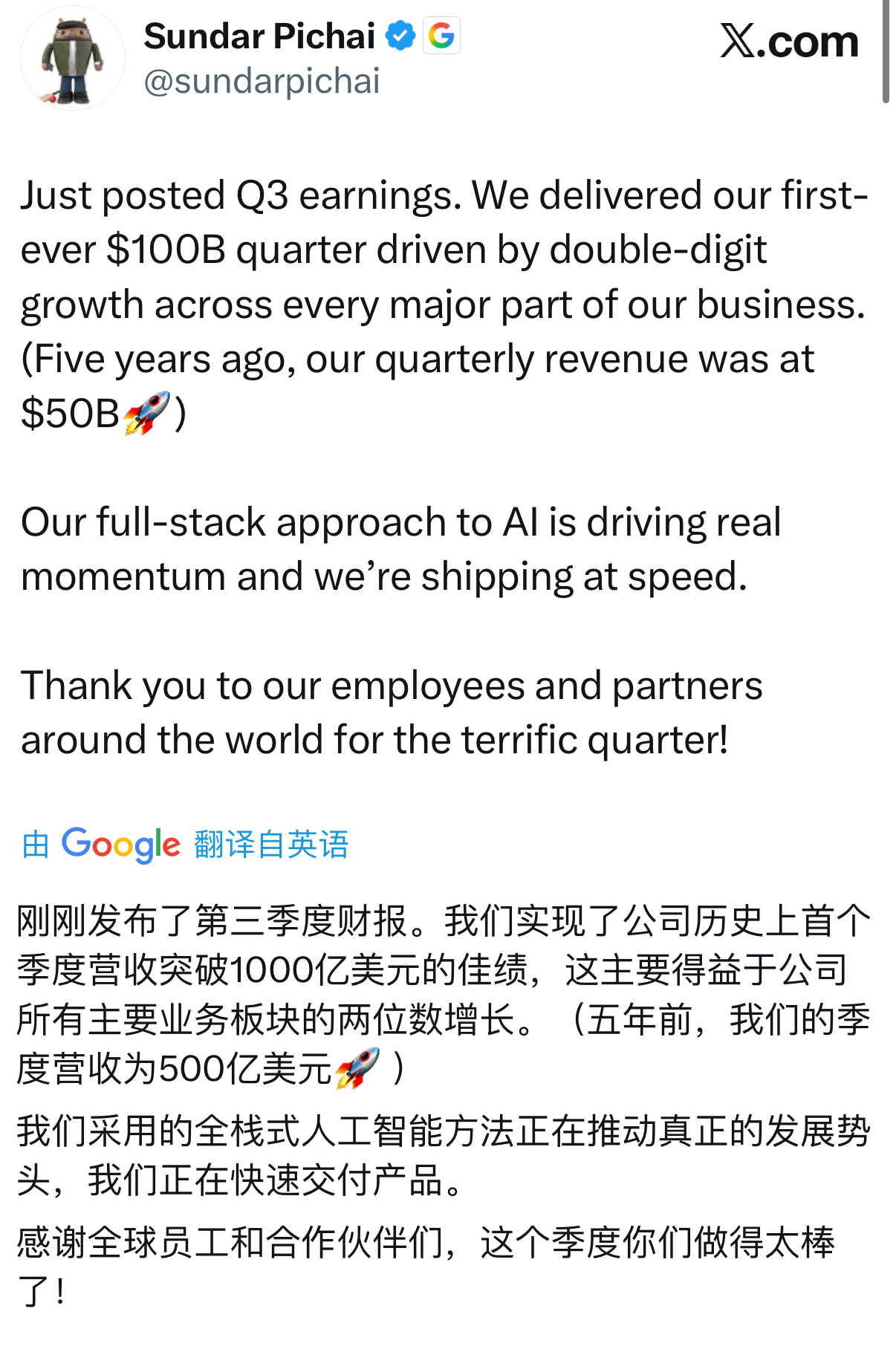 谷歌季度营收首破千亿,盘后上涨超6%!马斯克评“干得好”