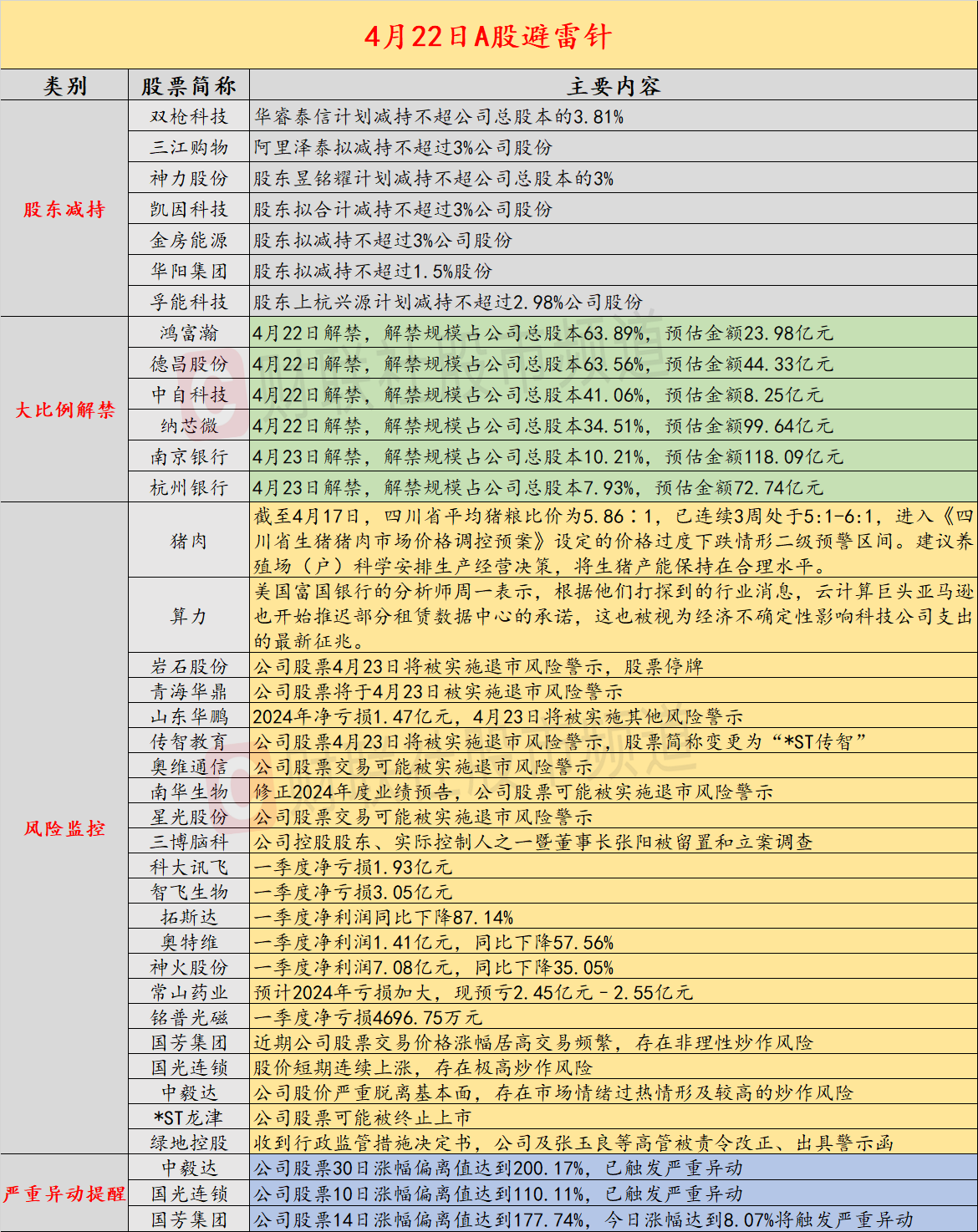 导读:智通财经4月22日投资避雷针,近日,A股及海外市场潜在风险事件如下。国内经济信息方面包括:1)四川发改委发布生猪价格过度下跌情形二级预 警公告;2)市价8.8万的机器人半马亚军松延动力N2被拍卖,成交价5.7万元;公司方面重点关注包括:1)岩石股份公司股票4月23日将被实施退市风险警 示,股票停牌;2)青海华鼎公司股票将于4月23日被实施退市风险警示;海外市场重点关注包括:1)美股三大股指均跌超2%,特斯拉跌近6%;2)富国银 行称,亚马逊已经暂停某些数据中心的租赁承诺。 经济信息 1、截至4月17日,四川省平均猪粮比价为5.86∶1,已连续3周处于5:1-6:1,进入《四川省生猪猪肉市场价格调控预案》设定的价格过度下跌情形二级预警区 间。建议养殖场(户)科学安排生产经营决策,将生猪产能保持在合理水平。 2、在全球首个人形机器人半程马拉松赛后,亚军机器人松延动力N2上架拍卖平台,显示市场价88000元,以1元起拍,最终以56806元成交。 3、人身保险业责任准备金评估利率专家咨询委员会21日公布,当前普通型人身保险产品预定利率研究值为2.13%,低于当前预定利率37个基点,差值首次 超过25个基点。业内 ...