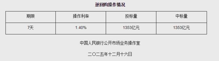 12月16日央行开展1353亿元7天期逆回购操作 中新网12月16日电 据央行网站消息,2025年12月16日中国人民银行以固定利率、数量招标方式开展了 1353亿元7天期逆回购操作。具体情况如下: | | 逆回购操作情况 | | | | --- | --- | --- | --- | | 期限 | 操作利率 | 投标量 | 中标量 | | 7天 | 1.40% do 1 1 1 1 1 = 1 = 1 7 1 - 1 7 11 | 1353亿元 | 1353亿元 | 广告等商务合作,请点击这里 本文为转载内容,授权事宜请联系原著作权人 中新经纬版权所有,未经书面授权,任何单位及个人不得转载、摘编或以其它方式使用。 关注中新经纬微信公众号(微信搜索"中新经纬"或"jwview"),看更多精彩财经资讯。 图源:央行网站截图 来源:中国新闻网 编辑:董文博 ...