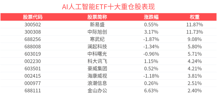 Group 1 - The Shanghai Stock Exchange aims to enhance the role of the Sci-Tech Innovation Board as a "testing ground" for identifying high-quality sci-tech enterprises, particularly in fields like artificial intelligence, commercial aerospace, and low-altitude economy [1] - As of October 28, 2025, the CSI Artificial Intelligence Theme Index (930713) increased by 0.21%, with notable gains in constituent stocks such as Kingsoft Office (688111) up 6.63% and Zhongji Xuchuang (300308) up 3.17% [1] - The AI Artificial Intelligence ETF (512930) also saw a rise of 0.22%, marking its third consecutive increase, with a latest price of 2.25 yuan and a weekly increase of 11.53% as of October 27, 2025 [1] Group 2 - The AI Artificial Intelligence ETF has a management fee of 0.15% and a custody fee of 0.05%, which are the lowest among comparable funds [2] - The ETF closely tracks the CSI Artificial Intelligence Theme Index, which includes 50 listed companies involved in providing resources, technology, and application support for artificial intelligence [2] - As of September 30, 2025, the top ten weighted stocks in the CSI Artificial Intelligence Theme Index accounted for 61.36% of the index, with New Yisheng (300502) and Zhongji Xuchuang (300308) being the top two [2] Group 3 - The top ten stocks in the CSI Artificial Intelligence Theme Index include New Yisheng (300502) with a weight of 11.87% and Zhongji Xuchuang (300308) with a weight of 11.73%, among others [3] - The performance of these stocks varies, with some experiencing gains while others, like Cambricon (688256) and Hikvision (002415), faced declines [3] Group 4 - The AI Artificial Intelligence ETF has several off-market connections, including Ping An CSI Artificial Intelligence Theme ETF Initiated Link A (023384) and others [5]