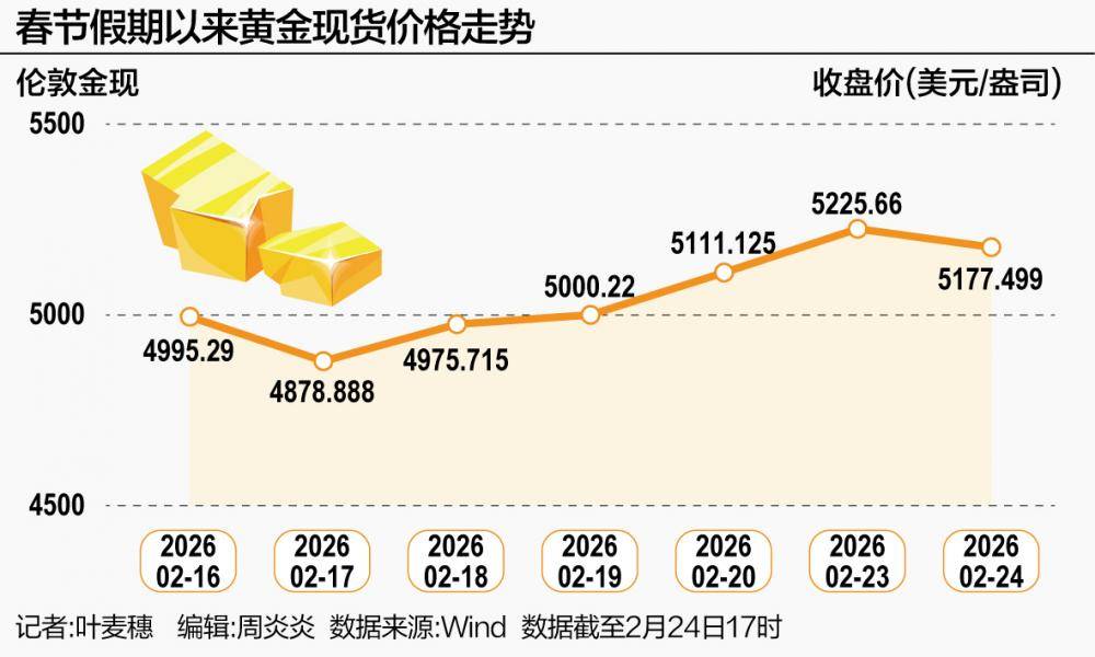 来源:21世纪经济报道 春节长假期间,黄金和白银再度表演过山车行情。 具体来说,黄金现货价格在2月16日、17日连续两日下跌,随后因美国贸易政策的不确定性以及伊朗局势持续紧张,促使投资者转向更安全的 资产,2月18日至23日又连着5个交易日上涨。 多家金店宣布近期将涨价 春节是贵金属的消费旺季,广州北京路商圈一家金店店员表示,尽管春节期间金价略有波动,但市民购金热情未减,有消费者单笔消费近8万 元,主要用于日常佩戴。在潮人聚集的天河商圈,小克重、设计感强的文创"轻金"更受青睐。不少"95后"成为消费新主力。 除自戴外,消费者也热衷将金饰作为新年礼物赠予亲友,其中10克左右的小金条最受欢迎。 "给儿子定投做纪念,每年买10克,到成年也是一笔不小的财富。"广州市民谭先生表示。他告诉记者,不会选择附加值高的饰品,而是选择更 有性价比的投资金条。 节后24日刚刚开盘的沪金和沪银也出现补涨行情,其中沪金主连上涨3.5%,沪银的涨幅更是达到了12.7%。 中国国际期货高级研究员汤林闽告诉记者,沪金节后开盘上涨,主要由三方面因素驱动: 一是特朗普关税影响"卷土重来"。春节期间,特朗普推行的大规模全球关税政策被判定违法,这引 ...