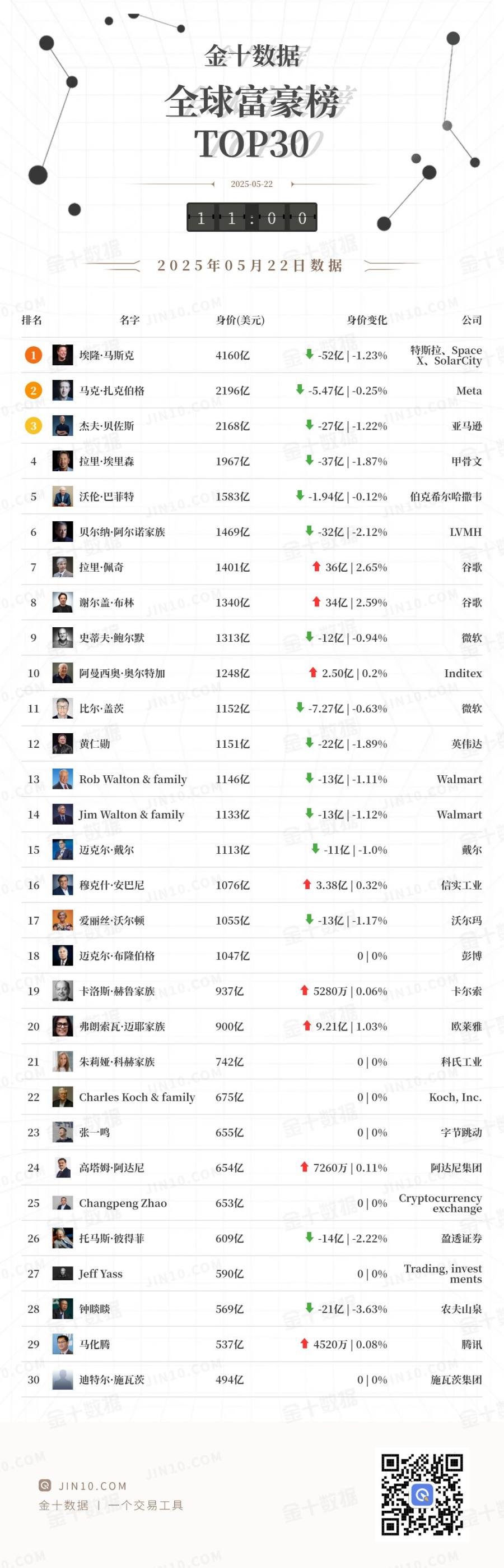 金十图示:2025年05月22日(周四)全球富豪榜